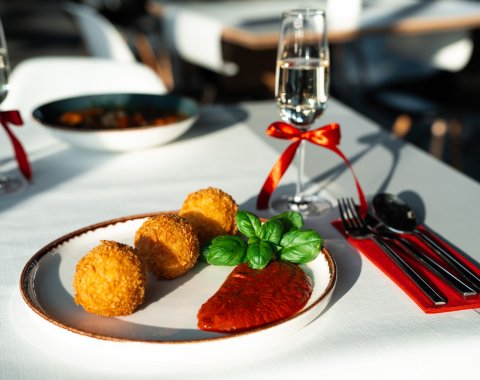Arancini mit Mozzarella in einer cremigen Tomaten-Basilikum-Sauce
